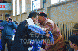 Зургаагийн даваанд гарди гоцлож, харцага начин хоёр тунан барилдлаа. Аргагүй их спортын мундагууд гэдгээ харуулж үзэгч олноо шагшуулсан сайхан барилдаан гаргав. Харилцан мэх хийлцэж нэлээдгүй шуугиулаад барьц сонгоонд хүрч харцага ард нь гараад тулгуур хөлд нь цохиж арагш сэгсэрч татаад тун дөхүүлсэн ч начин үетэйгээ харуулж өвдөглөлгүй босов. Улмаар харцагыг гуд татахад бултаж зайлаад харцага өөрөө унах шахсан бөгөөд начин араас нь барьж аваад алдчихав. Хэн хэн нь барьцаа бүрэн алдсан тул барьц сонгох ээлж начинд ирж начин барьц сонгоод өргөсөн ч олимпийн аварга сөрж сүлбэж этээд давснаар аргагүй их спортоор хичээллэж их амжилтад хүрсэн хүн гэдгийг нотлох баталгаа байлаа.
