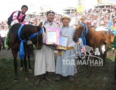 -Харин их морь нь км хэртэй тасархай түрүүлсэн. Мориныхоо хөлсийг нь хусчихаад байхад дараагийн морь гарч ирээгүй л байсан юмдаг. Ийнхүү Төв аймагт их морь түрүүлгэж, азарга аман хүзүүдүүлсэн.Эндээс Боржигонд очиж наадаад зээрд азарга гурваар орсон. Харин халзан морь гараад л зугтаачихсан. Нэг жижигхэн буурал морь араас нь хөөсөөр байгаад яг бариан дээр шахаад ороод ирсэн. Тэгсэн пайз өгч байнаа. Бодвол халзан морь зурхай дээр түрүүлж гишгэсэн юм байлгүй. Тэгсэнээ удалгүй майхан дээр маань ирээд “пайзыг хураалаа” гээд аваад явчихдаг байгаа. Ингээд аман хүзүүдсэн юм.
